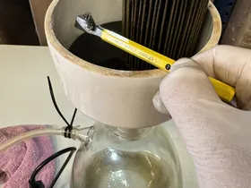 Ich analysiere jetzt das Öl. Den Ölfilter sauge ich mit einem Bunchnerfilter und einem Stück Filterpapier komplett aus. Als Lösungsmittel verwende ich D-Limone. Nur um euch schneller auf den neuesten Stand zu bringen, habe ich eine kleine Menge des Schlamms durch den Bunchner-Filter laufen lassen. (Der gesamte Schlamm aus dem Ölfilter läuft immer noch durch, aber sehr langsam, weil der Filter verstopft ist) Auf dem Filterpapier sind kleine weiße Kristalle zu sehen. Das Weiße, das Sie sehen, ist das gesamte Filterpapier, das mit zuckerähnlichen Kristallen bedeckt ist (wenn auch kleiner als Zucker).