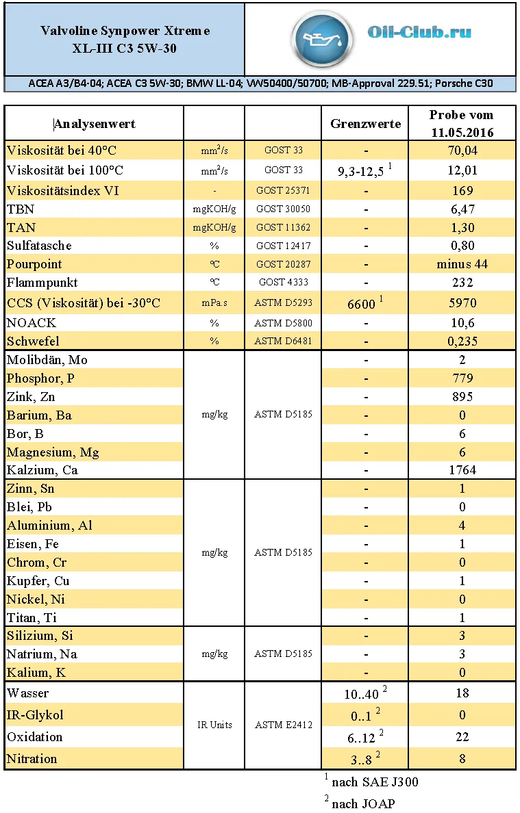 - Schwefel: 0,235 – wenig, Additivpaket ist modern, Grundöl ist sehr sauber, entspricht ACEA C3 (≤ 0,3)