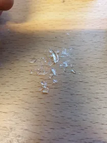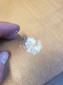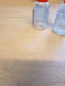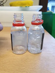 Auffällig: der "Rest" der Flasche die in Ordnung war ist an der Luft komplett ausgehärtet. Die Stückchen lassen sich mit dem Finger zerdrücken, sind aber komplett hart.