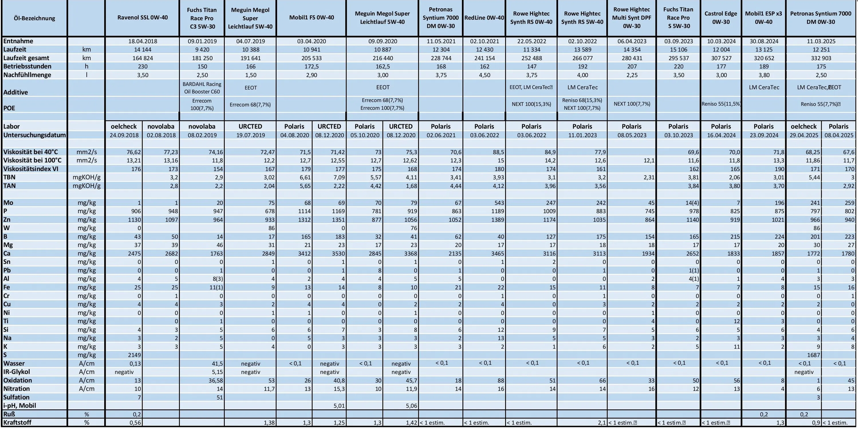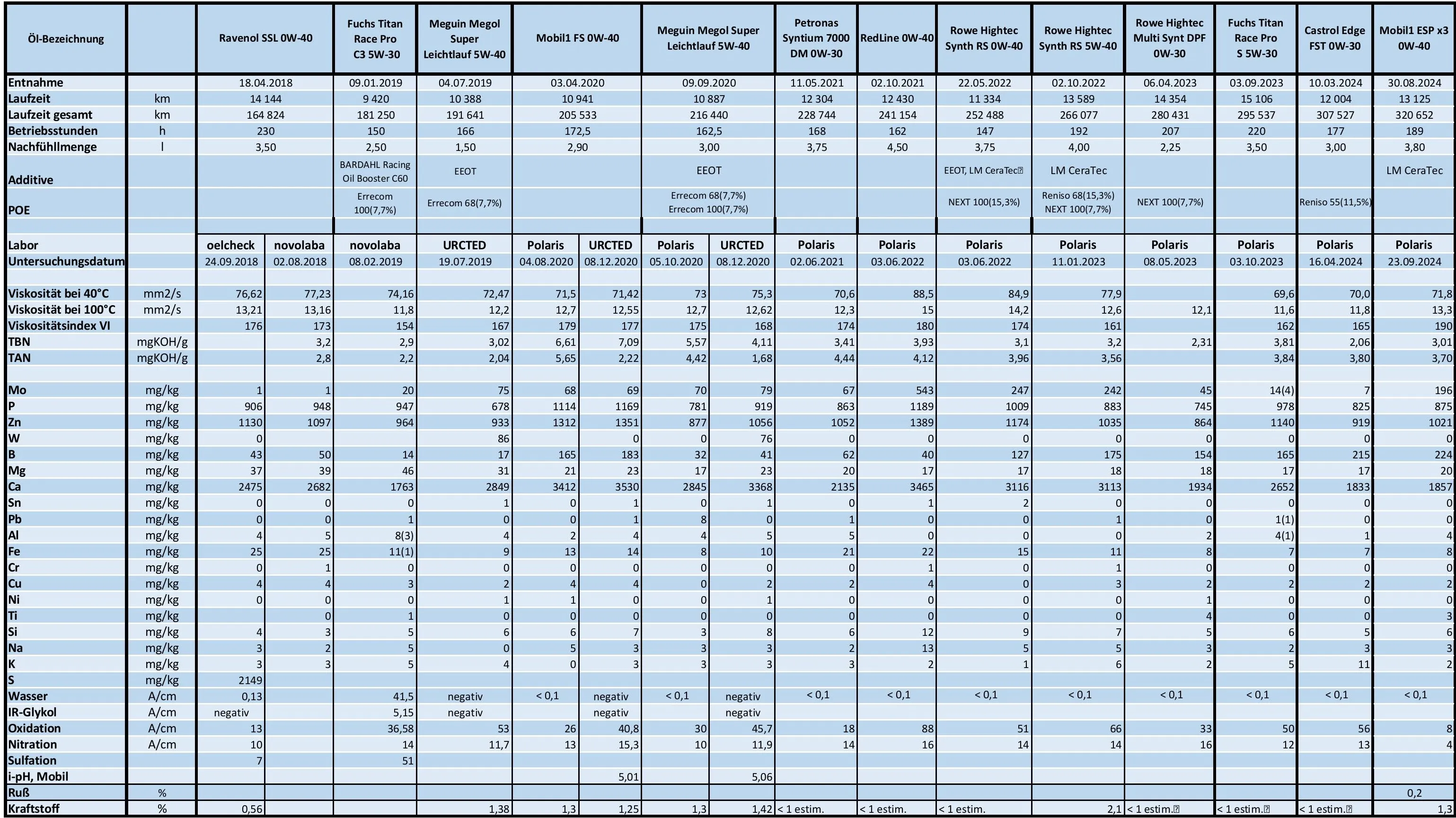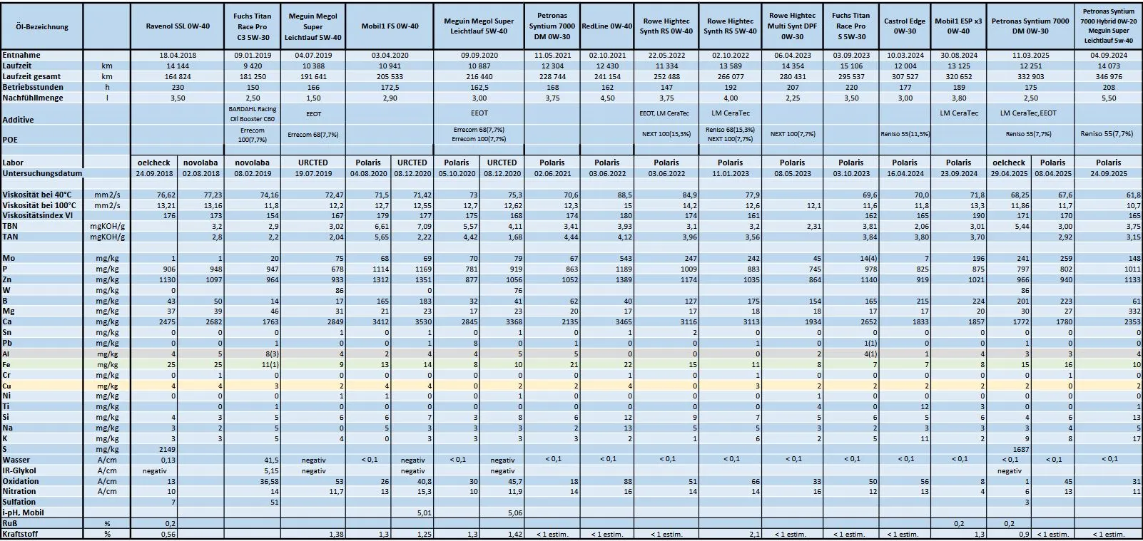 Leider ist das Eisen zweimal gestiegen. Deswegen habe ich eine Analyse in zweiter Labor bestellt. Jetzt fahre ich eine noch dünnere Mischung - Petronas Syntium 7000 Hybrid 0w20 + Megun Megol SL 5w40 mit Viskosität bei 100°C von 10,4 mm2/s. Mit dieser ist aber der Ölverbrauch auch gestiegen.